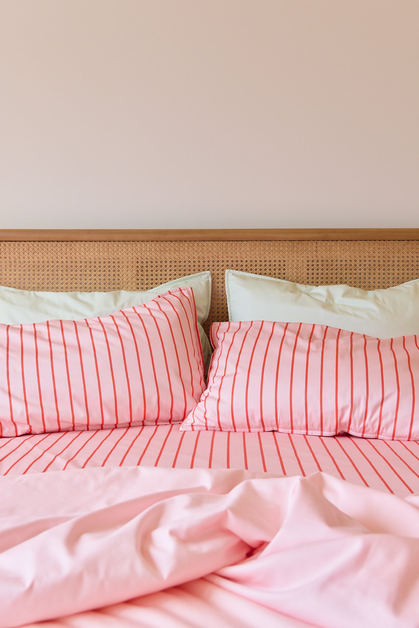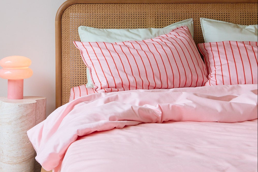 Raspberry Stripe: pairs a soft blush pink base with bold raspberry stripes for a look that’s both sweet and striking. It’s the perfect balance of gentle tones for sleep spaces with a playful burst of colour that makes bedtime feel a little more fun.